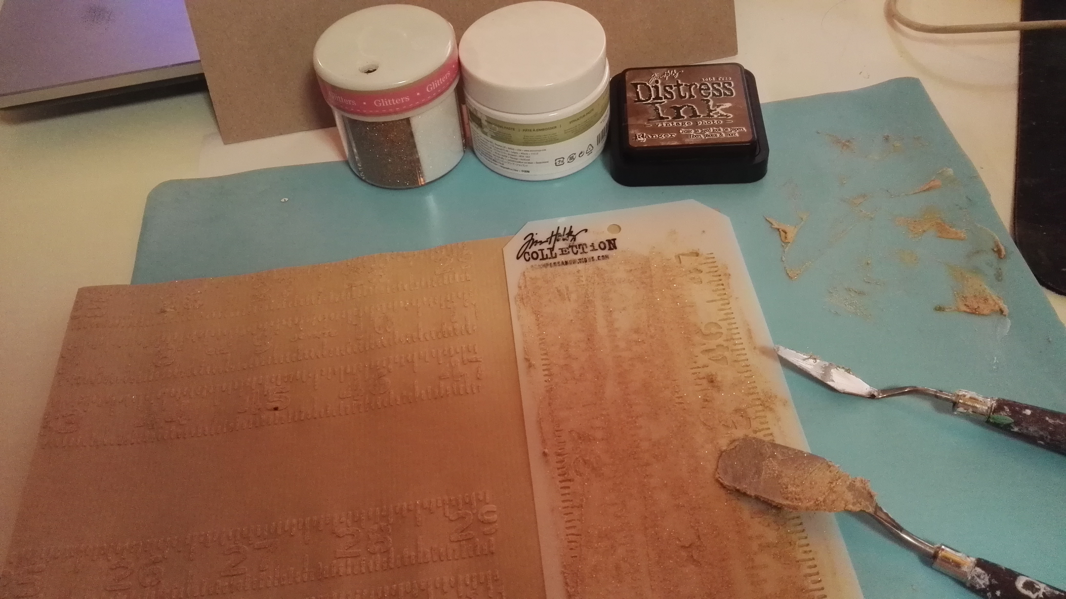 Die Strukturmasse von SU kann gut mit Stempelfarbe, sowie mit Glitzer eingefärbt werden. Ich nutze hier als Unterlage eine Silikon-Backmatte, die bestens dafür geeigenet ist, die Masse anzurühren, denn sie ist extrem Pflegeleicht. Einfach mit einem feuchten Tuch nachwischen und sie ist perfekt sauber. Der Nachtteil der Matte ist allerdings, das sie jedes Fussel förmlich anzieht und man Gefahr läuft, das mit einzuarbeiten. Mit einer Katze im Haushalt geht man auf Katzenhaarjagd 😉