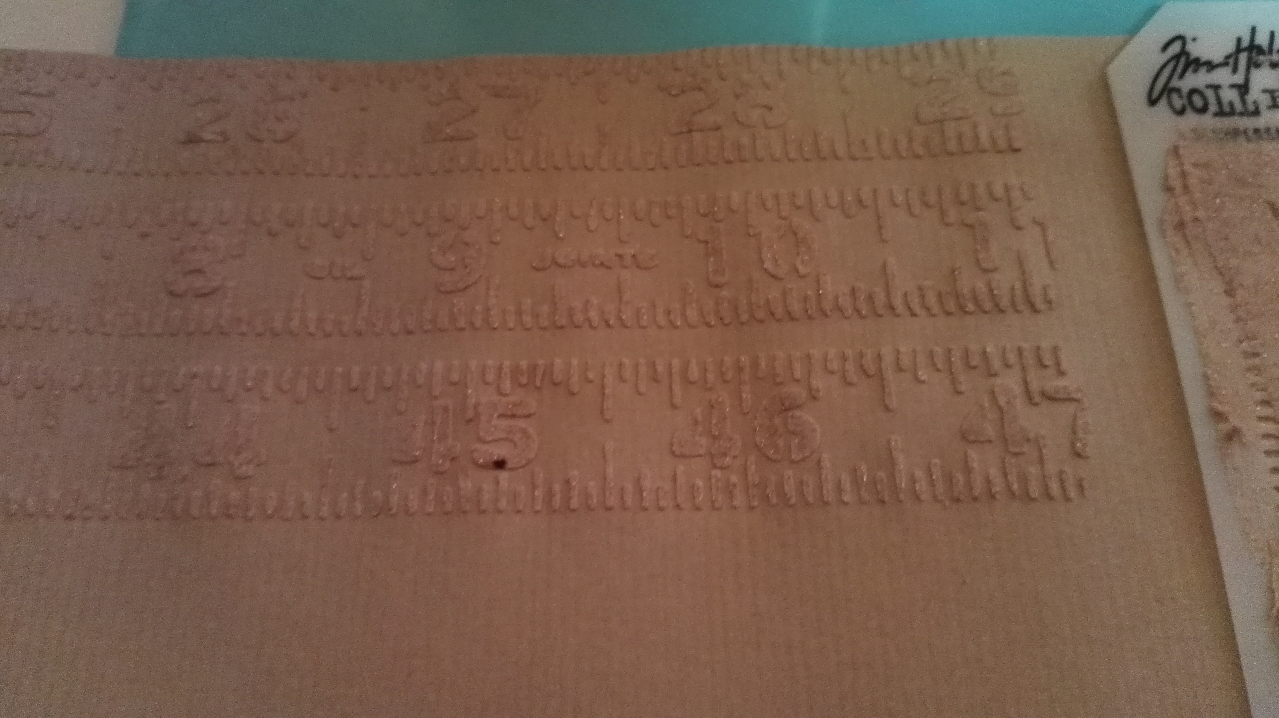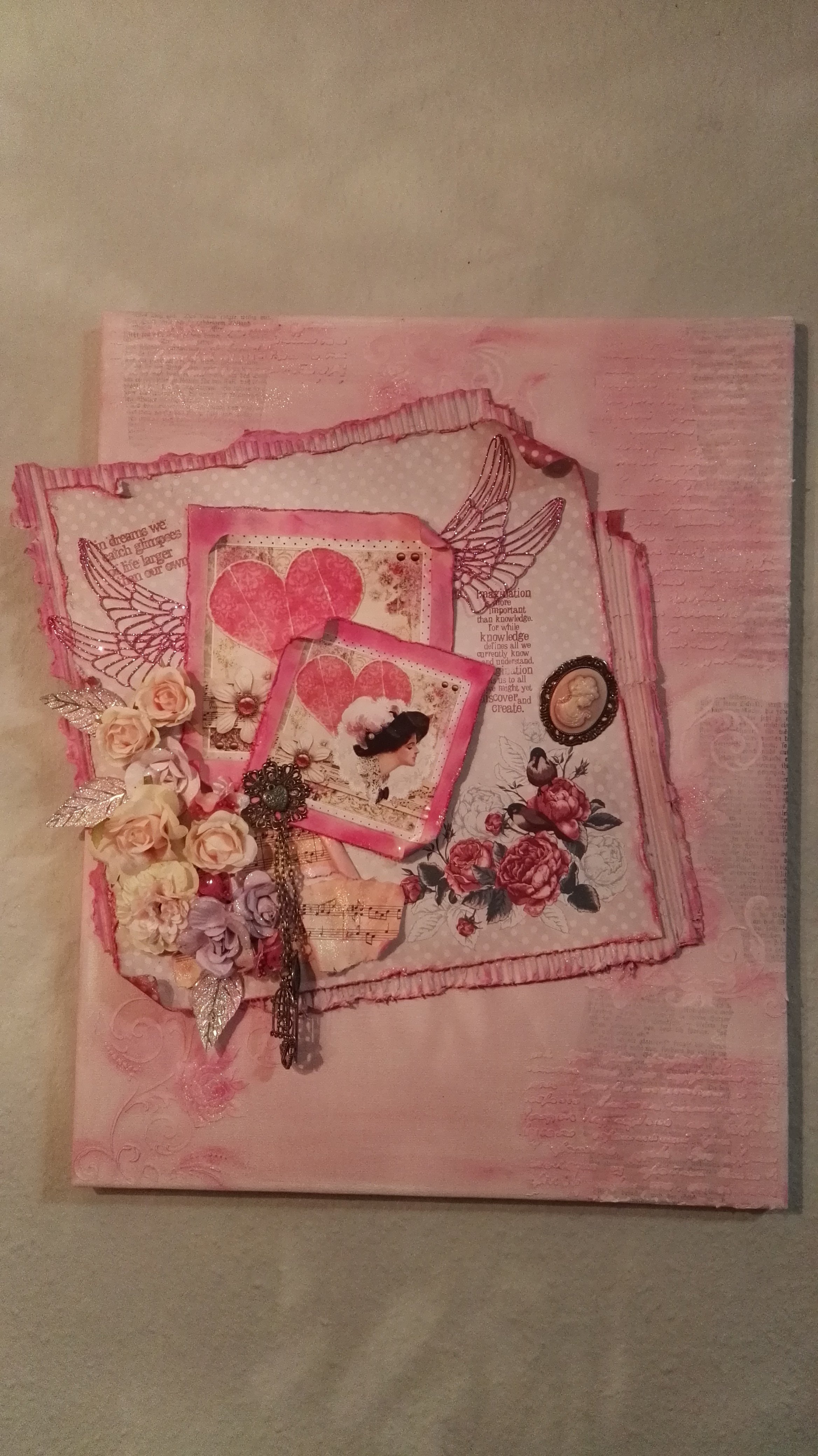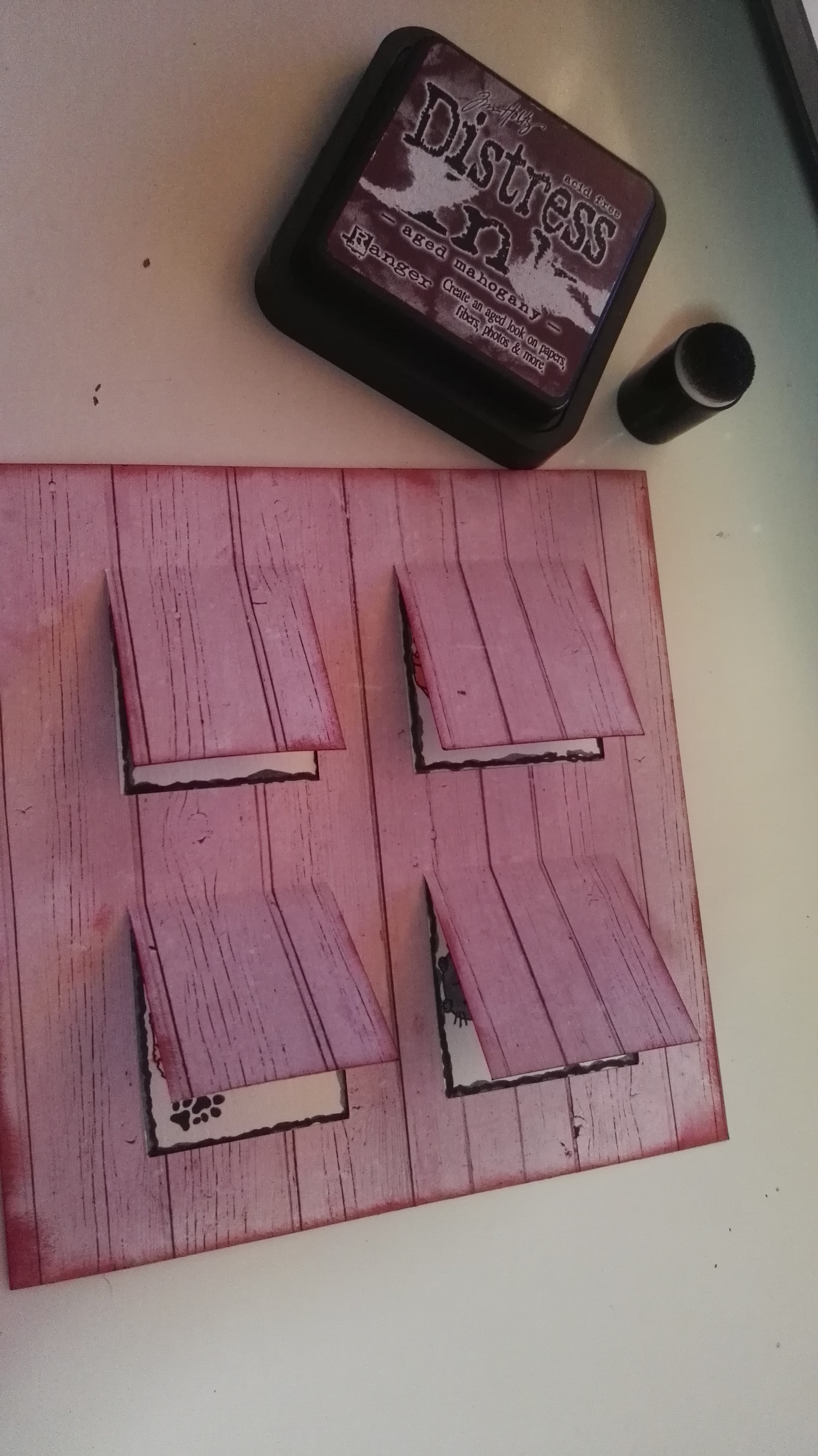 Der eigentliche Layer besteht aus einem 30 x 30 cm Papier, welches ich mit einem Distresser aufgerissen habe. Unter diesem habe ich Wellpappe, welche ebenfalls eingerissen wurde, festgeklebt. Die Farbe der Leinwand findet sich auch auf der Wellpappe wieder. Ebenfalls die Stempelfarbe, die ich am Rand mit einem Schwämmchen aufgetragen habe.
