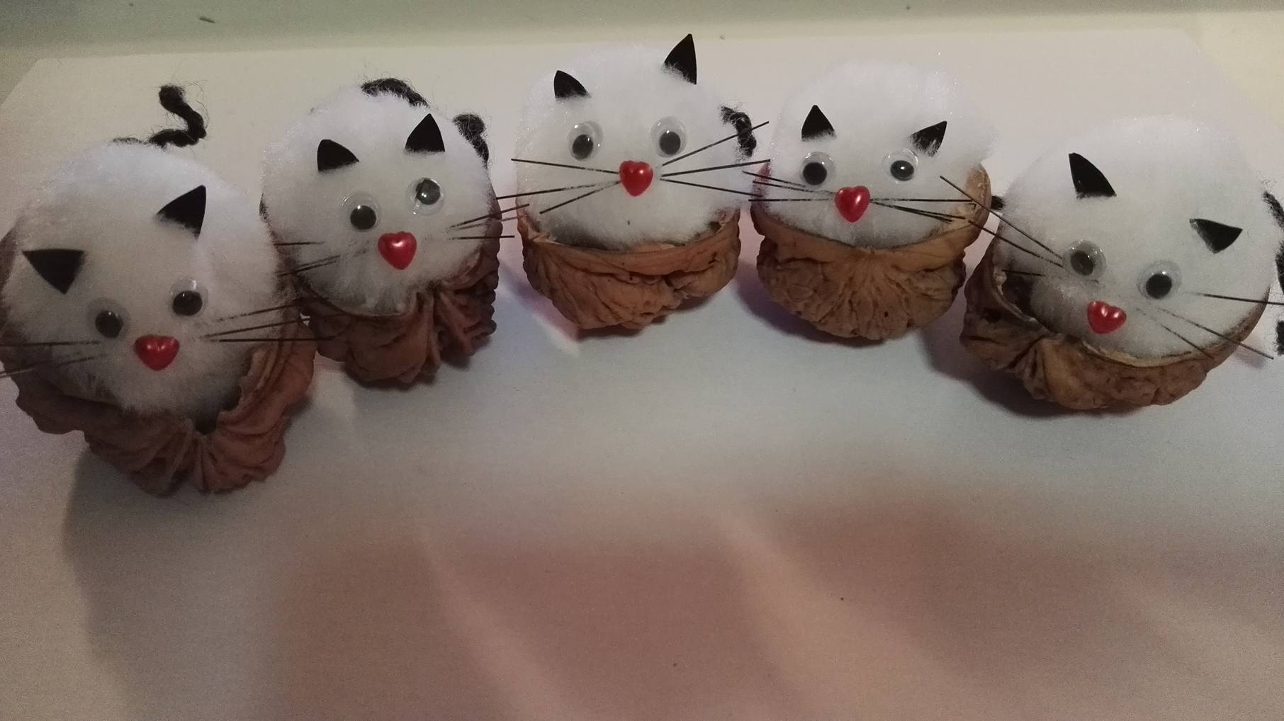 Man klebt ein kleines Wollrestestück als Schwanz und die Pomboms in die saubere Walnusshälfte und läßt diese antrocknen. In der Zwischenzeit kann man aus dem Cardstock kleine Öhrchen zuschneiden. Dem Besen klaut man ein paar Haare.